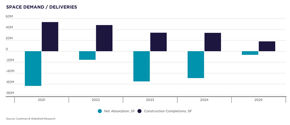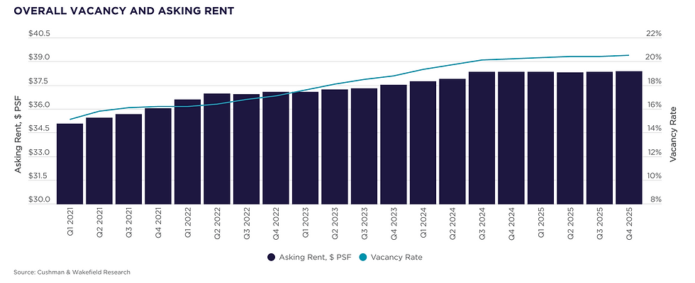 Office market fundamentals began to improve in early 2024, when sublease inventories and vacancy increases peaked. By the second half of 2025, these positive signs had solidified into a clear recovery. Net absorption turned positive in the final six months of 2025 (+2.5 msf), marking the strongest back-to-back quarterly performance since COVID, aside from the brief rebound in early 2021. Higher-quality buildings drew even more attention, with Class A absorption near +3.5 msf in Q4 2025 and topping +9.2 msf for the full year.